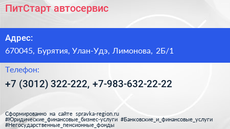 ПитСтарт, автосервис по адресу 670045, Бурятия, Улан-Удэ, Лимонова, 2Б/1 в дальнейшем Организация, размещена в следующих категориях: