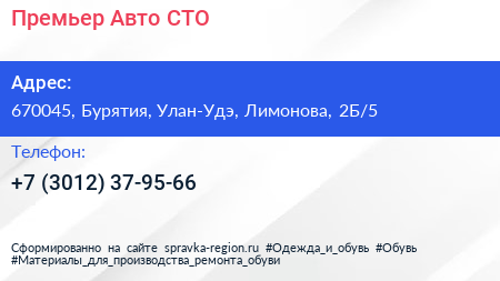 Премьер-Авто, СТО по адресу 670045, Бурятия, Улан-Удэ, Лимонова, 2Б/5 в дальнейшем Организация, размещена в следующих категориях: