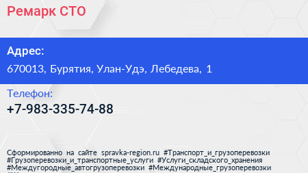 Ремарк, СТО по адресу 670013, Бурятия, Улан-Удэ, Лебедева, 1 в дальнейшем Организация, размещена в следующих категориях: