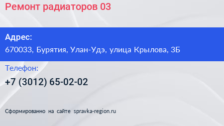 Ремонт радиаторов 03 по адресу 670033, Бурятия, Улан-Удэ, улица Крылова, 3Б в дальнейшем Организация, размещена в следующих категориях: