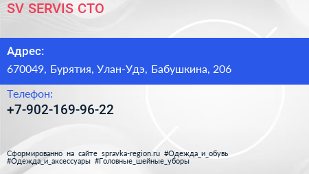 SV-SERVIS, СТО по адресу 670049, Бурятия, Улан-Удэ, Бабушкина, 206 в дальнейшем Организация, размещена в следующих категориях: