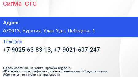 СигМа+, СТО по адресу 670013, Бурятия, Улан-Удэ, Лебедева, 1 в дальнейшем Организация, размещена в следующих категориях: