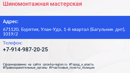 Шиномонтажная мастерская по адресу 671120, Бурятия, Улан-Удэ, 1-й квартал (Багульник днт), 1019/2 в дальнейшем Организация, размещена в следующих категориях: