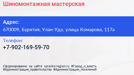 Шиномонтажная мастерская по адресу 670009, Бурятия, Улан-Удэ, улица Комарова, 117а в дальнейшем Организация, размещена в следующих категориях: