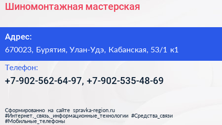 Шиномонтажная мастерская по адресу 670023, Бурятия, Улан-Удэ, Кабанская, 53/1 к1 в дальнейшем Организация, размещена в следующих категориях: