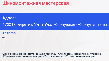 Шиномонтажная мастерская по адресу 670018, Бурятия, Улан-Удэ, Жемчужная (Жемчуг днт), 6а в дальнейшем Организация, размещена в следующих категориях: