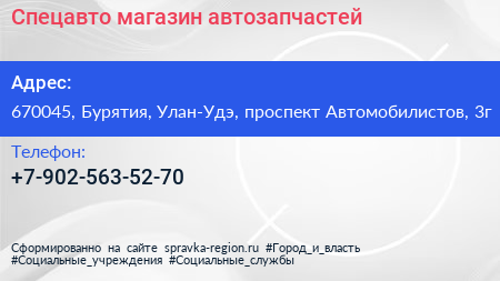 Спецавто, магазин автозапчастей по адресу 670045, Бурятия, Улан-Удэ, проспект Автомобилистов, 3г в дальнейшем Организация, размещена в следующих категориях: