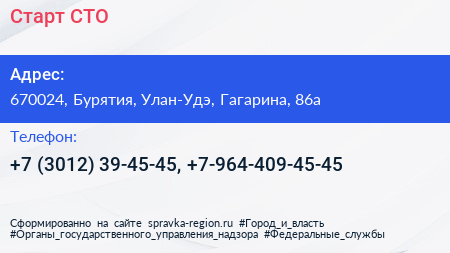 Старт, СТО по адресу 670024, Бурятия, Улан-Удэ, Гагарина, 86а в дальнейшем Организация, размещена в следующих категориях: