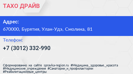 ТАХО ДРАЙВ по адресу 670000, Бурятия, Улан-Удэ, Смолина, 81 в дальнейшем Организация, размещена в следующих категориях: