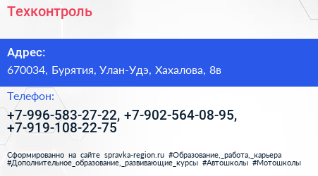Техконтроль по адресу 670034, Бурятия, Улан-Удэ, Хахалова, 8в в дальнейшем Организация, размещена в следующих категориях:
