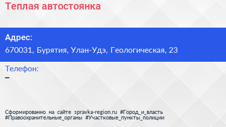Теплая автостоянка по адресу 670031, Бурятия, Улан-Удэ, Геологическая, 23 в дальнейшем Организация, размещена в следующих категориях: