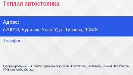 Теплая автостоянка по адресу 670013, Бурятия, Улан-Удэ, Тулаева, 108/8 в дальнейшем Организация, размещена в следующих категориях: