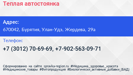 Теплая автостоянка по адресу 670042, Бурятия, Улан-Удэ, Жердева, 29а в дальнейшем Организация, размещена в следующих категориях: