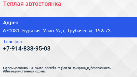 Теплая автостоянка по адресу 670031, Бурятия, Улан-Удэ, Трубачеева, 152а/3 в дальнейшем Организация, размещена в следующих категориях: