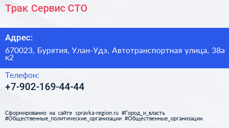 Трак Сервис, СТО по адресу 670023, Бурятия, Улан-Удэ, Автотранспортная улица, 38а к2 в дальнейшем Организация, размещена в следующих категориях: