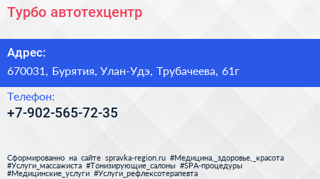 Турбо, автотехцентр по адресу 670031, Бурятия, Улан-Удэ, Трубачеева, 61г в дальнейшем Организация, размещена в следующих категориях:
