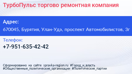 ТурбоПульс, торгово-ремонтная компания по адресу 670045, Бурятия, Улан-Удэ, проспект Автомобилистов, 3г в дальнейшем Организация, размещена в следующих категориях: