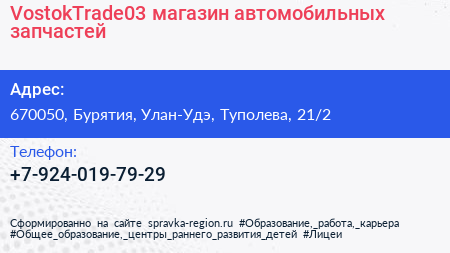 VostokTrade03, магазин автомобильных запчастей по адресу 670050, Бурятия, Улан-Удэ, Туполева, 21/2 в дальнейшем Организация, размещена в следующих категориях: