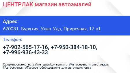 ЦЕНТРЛАК, магазин автоэмалей по адресу 670031, Бурятия, Улан-Удэ, Приречная, 17 к1 в дальнейшем Организация, размещена в следующих категориях:
