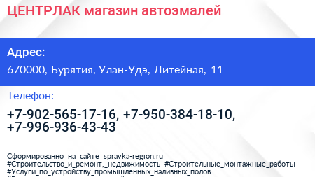 ЦЕНТРЛАК, магазин автоэмалей по адресу 670000, Бурятия, Улан-Удэ, Литейная, 11 в дальнейшем Организация, размещена в следующих категориях: