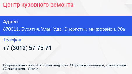 Центр кузовного ремонта по адресу 670011, Бурятия, Улан-Удэ, Энергетик микрорайон, 90а в дальнейшем Организация, размещена в следующих категориях: