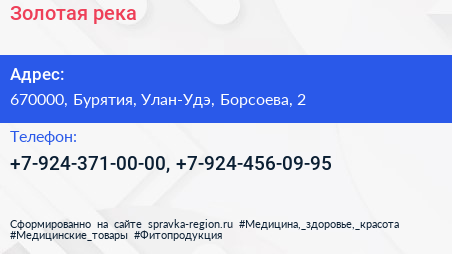 Золотая река по адресу 670000, Бурятия, Улан-Удэ, Борсоева, 2 в дальнейшем Организация, размещена в следующих категориях: