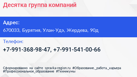 Десятка, группа компаний по адресу 670033, Бурятия, Улан-Удэ, Жердева, 90д в дальнейшем Организация, размещена в следующих категориях: