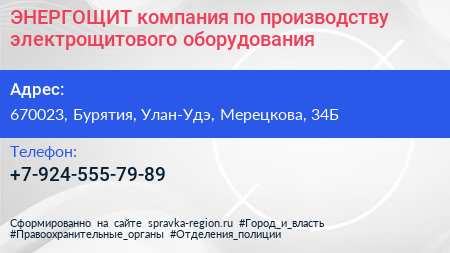 ЭНЕРГОЩИТ, компания по производству электрощитового оборудования по адресу 670023, Бурятия, Улан-Удэ, Мерецкова, 34Б в дальнейшем Организация, размещена в следующих категориях: