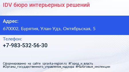 IDV, бюро интерьерных решений по адресу 670002, Бурятия, Улан-Удэ, Октябрьская, 5 в дальнейшем Организация, размещена в следующих категориях: