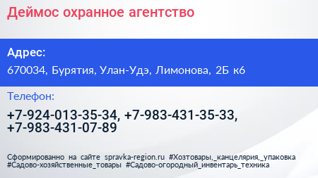 Деймос, охранное агентство по адресу 670034, Бурятия, Улан-Удэ, Лимонова, 2Б к6 в дальнейшем Организация, размещена в следующих категориях: