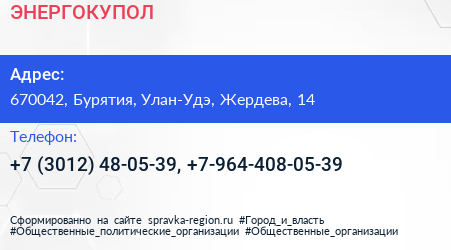 ЭНЕРГОКУПОЛ по адресу 670042, Бурятия, Улан-Удэ, Жердева, 14 в дальнейшем Организация, размещена в следующих категориях: