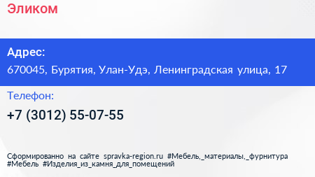Эликом по адресу 670045, Бурятия, Улан-Удэ, Ленинградская улица, 17 в дальнейшем Организация, размещена в следующих категориях: