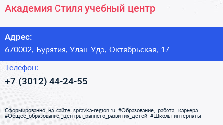 Академия Стиля, учебный центр по адресу 670002, Бурятия, Улан-Удэ, Октябрьская, 17 в дальнейшем Организация, размещена в следующих категориях: