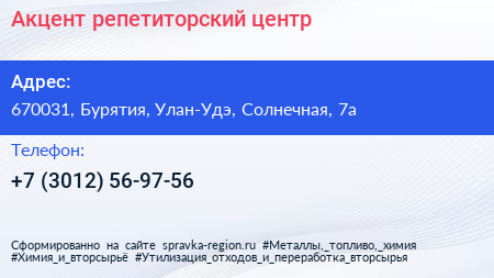Акцент, репетиторский центр по адресу 670031, Бурятия, Улан-Удэ, Солнечная, 7а в дальнейшем Организация, размещена в следующих категориях: