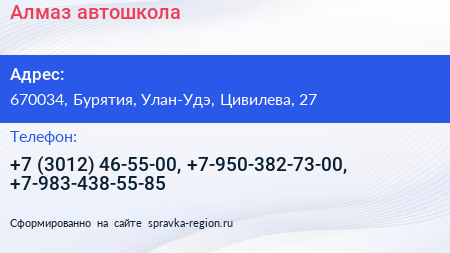 Алмаз, автошкола по адресу 670034, Бурятия, Улан-Удэ, Цивилева, 27 в дальнейшем Организация, размещена в следующих категориях: