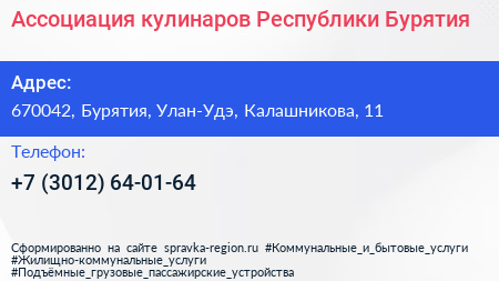 Ассоциация кулинаров Республики Бурятия по адресу 670042, Бурятия, Улан-Удэ, Калашникова, 11 в дальнейшем Организация, размещена в следующих категориях: