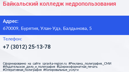 Байкальский колледж недропользования по адресу 670009, Бурятия, Улан-Удэ, Балдынова, 5 в дальнейшем Организация, размещена в следующих категориях: