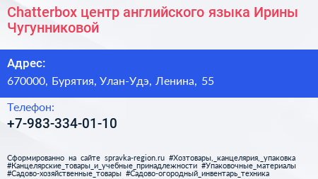 Chatterbox, центр английского языка Ирины Чугунниковой по адресу 670000, Бурятия, Улан-Удэ, Ленина, 55 в дальнейшем Организация, размещена в следующих категориях: