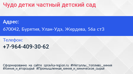 Чудо-детки, частный детский сад по адресу 670042, Бурятия, Улан-Удэ, Жердева, 56а ст3 в дальнейшем Организация, размещена в следующих категориях: