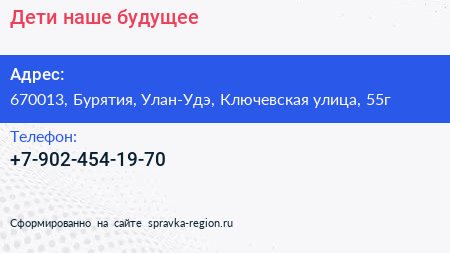 Дети-наше будущее по адресу 670013, Бурятия, Улан-Удэ, Ключевская улица, 55г в дальнейшем Организация, размещена в следующих категориях: