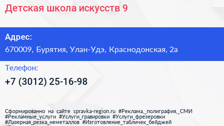 Детская школа искусств №9 по адресу 670009, Бурятия, Улан-Удэ, Краснодонская, 2а в дальнейшем Организация, размещена в следующих категориях: