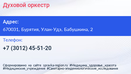 Духовой оркестр по адресу 670031, Бурятия, Улан-Удэ, Бабушкина, 2 в дальнейшем Организация, размещена в следующих категориях: