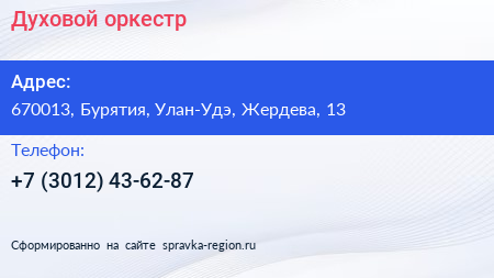 Духовой оркестр по адресу 670013, Бурятия, Улан-Удэ, Жердева, 13 в дальнейшем Организация, размещена в следующих категориях: