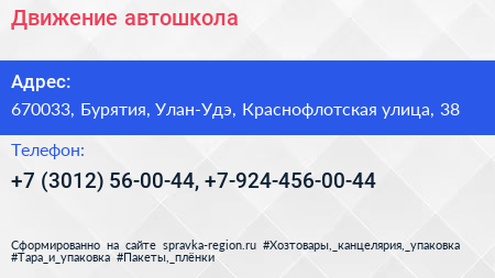 Движение, автошкола по адресу 670033, Бурятия, Улан-Удэ, Краснофлотская улица, 38 в дальнейшем Организация, размещена в следующих категориях: