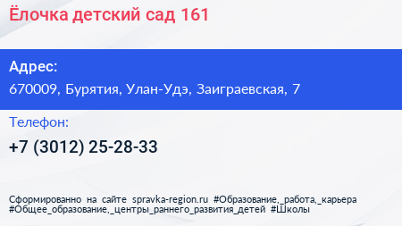 Ёлочка, детский сад №161 по адресу 670009, Бурятия, Улан-Удэ, Заиграевская, 7 в дальнейшем Организация, размещена в следующих категориях: