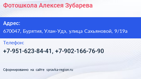 Фотошкола Алексея Зубарева по адресу 670047, Бурятия, Улан-Удэ, улица Сахьяновой, 9/19а в дальнейшем Организация, размещена в следующих категориях: