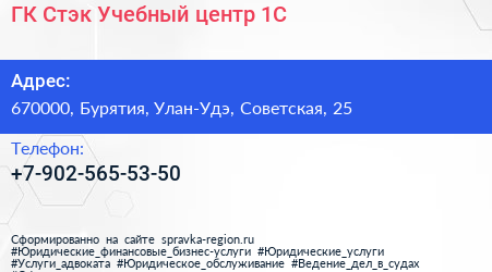 ГК Стэк: Учебный центр 1С по адресу 670000, Бурятия, Улан-Удэ, Советская, 25 в дальнейшем Организация, размещена в следующих категориях: