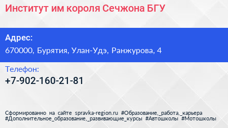 Институт им. короля Сечжона, БГУ по адресу 670000, Бурятия, Улан-Удэ, Ранжурова, 4 в дальнейшем Организация, размещена в следующих категориях: