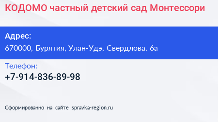 КОДОМО, частный детский сад Монтессори по адресу 670000, Бурятия, Улан-Удэ, Свердлова, 6а в дальнейшем Организация, размещена в следующих категориях: