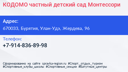 КОДОМО, частный детский сад Монтессори по адресу 670033, Бурятия, Улан-Удэ, Жердева, 96 в дальнейшем Организация, размещена в следующих категориях: